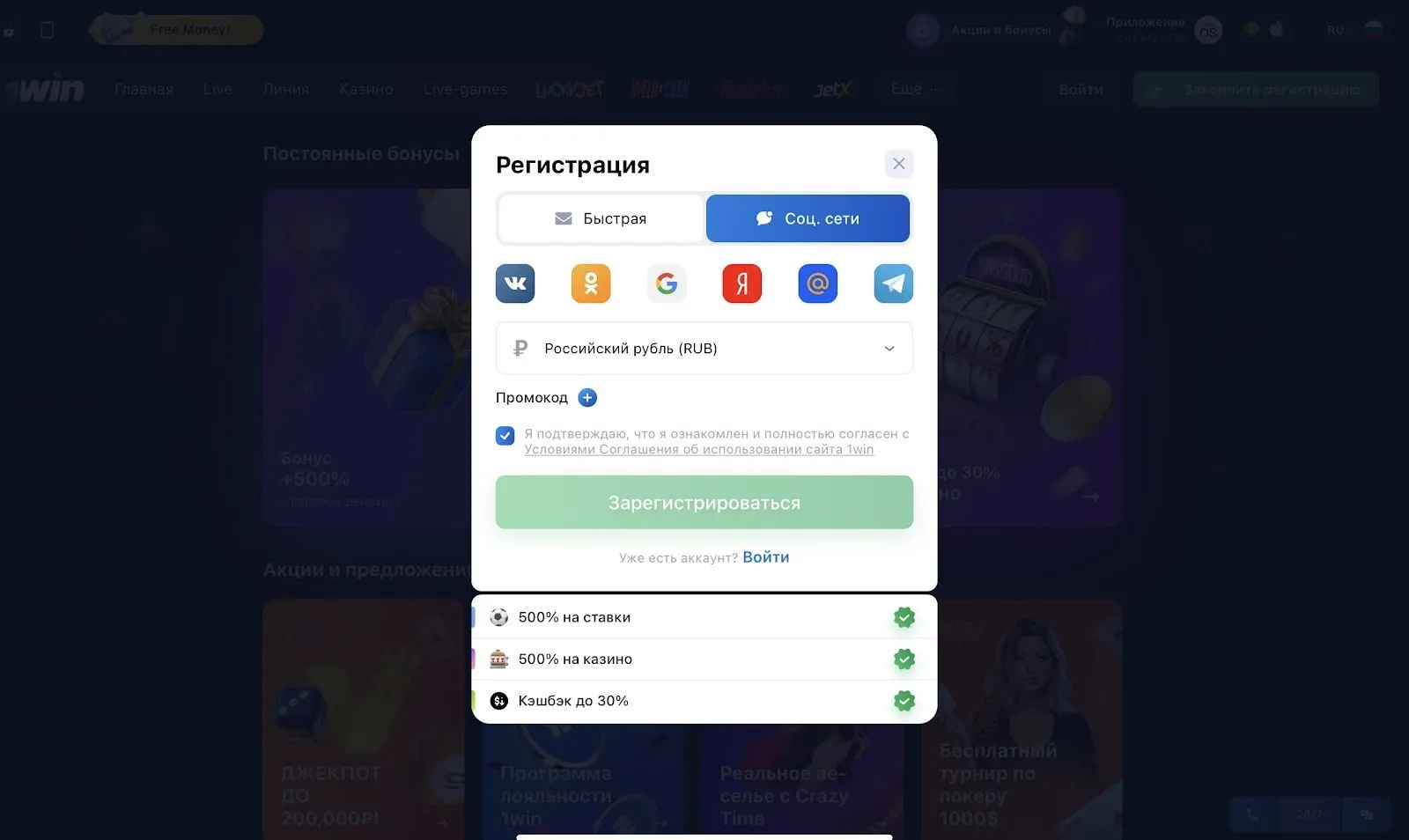 Стартовый бонус выдается только единожды. Пользователю нужно зарегистрироваться и пополнить счет. Регистрация проводится через социальные сети или номер телефона.